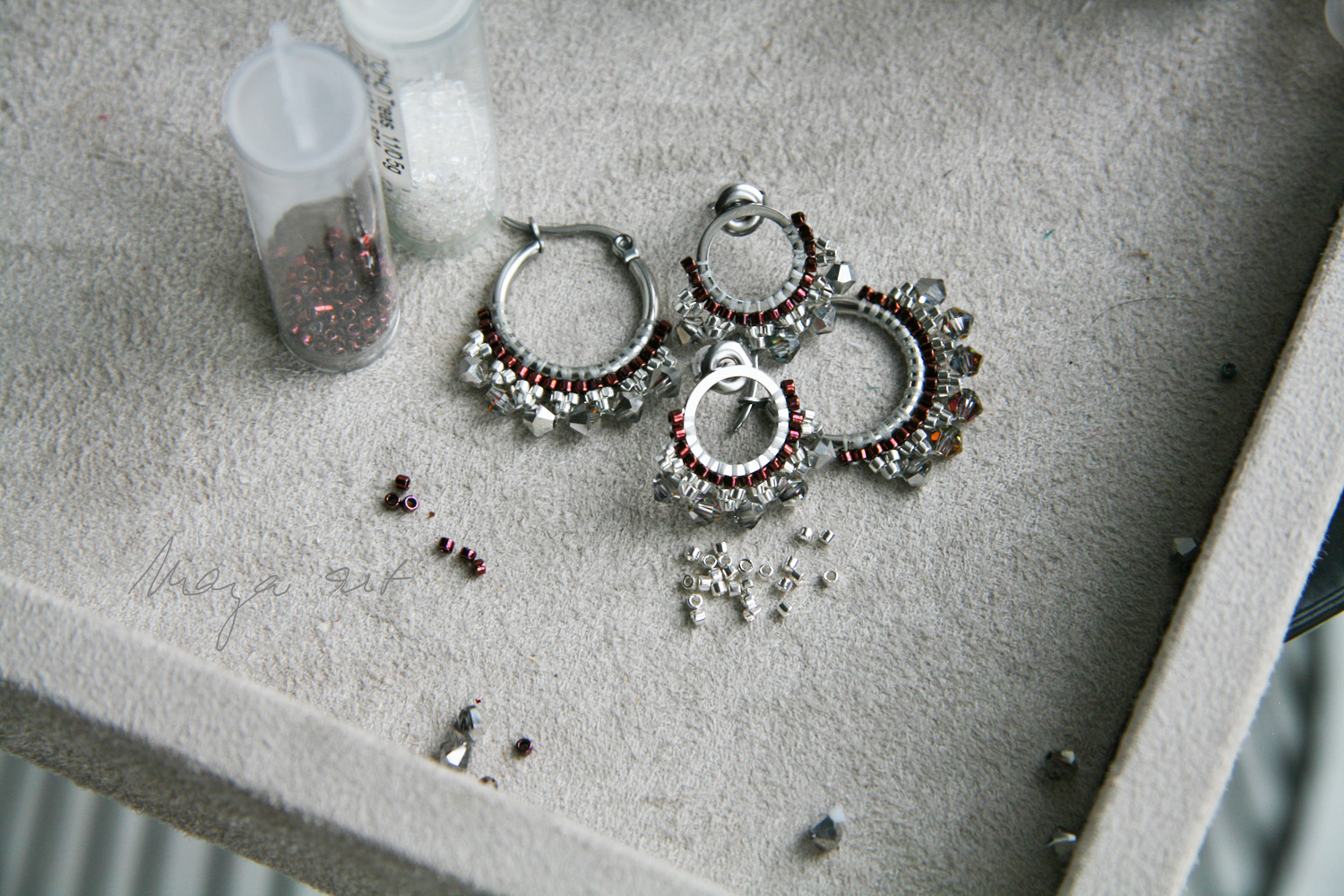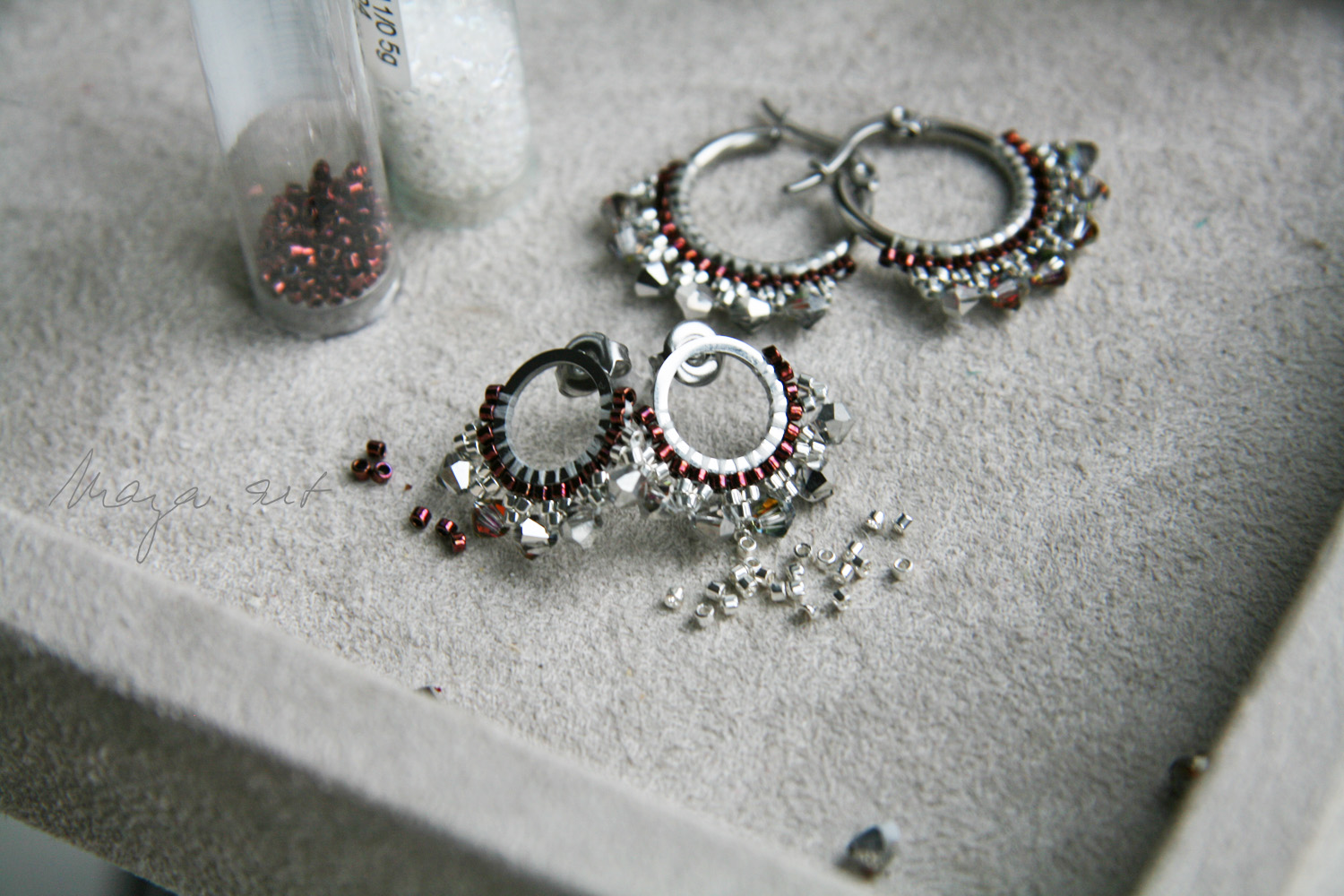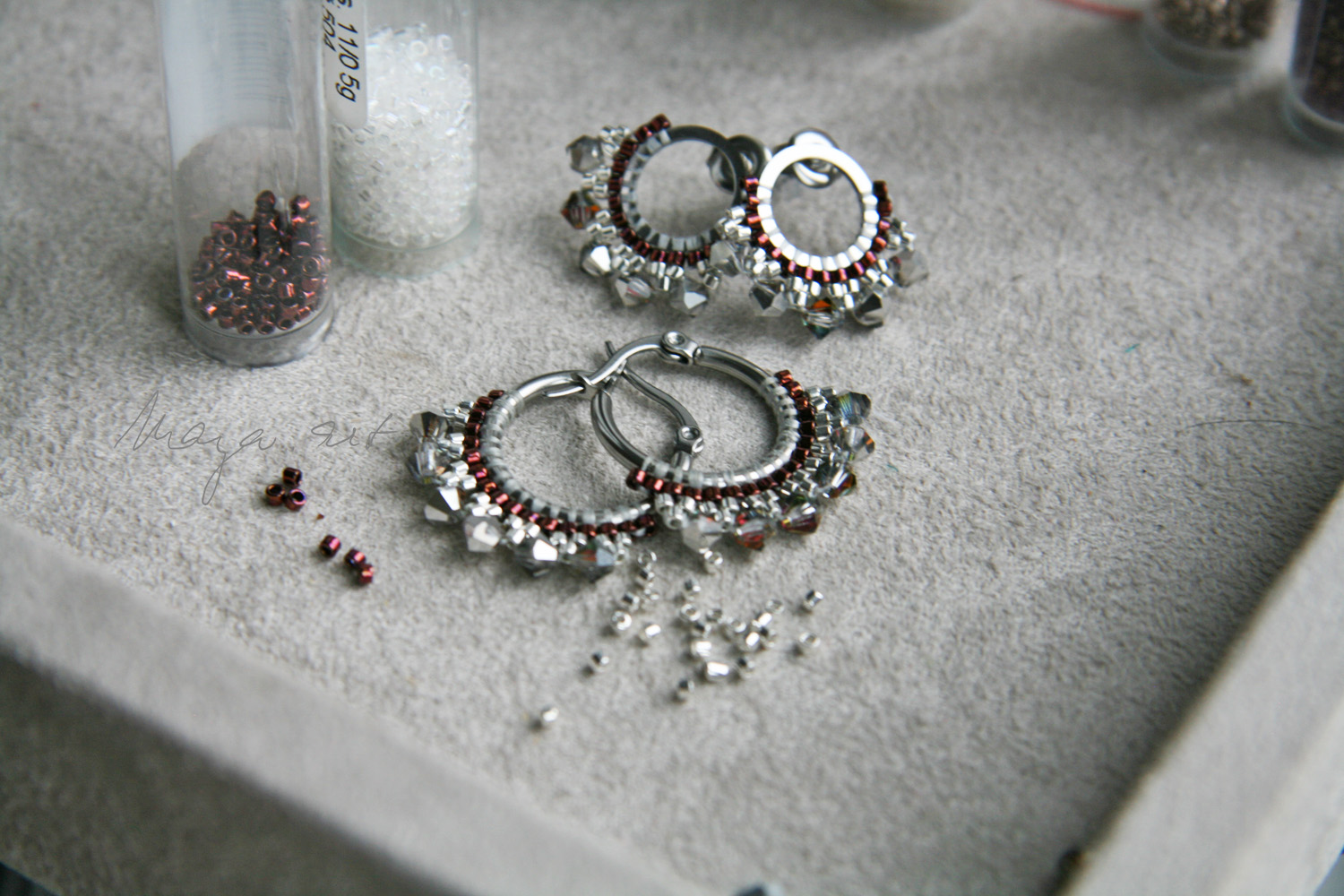 stitch" z japonských MIYUKI korálků a zdobené PRECIOSA broušenými korálky. Šité jsou na náušnicových kroužcích z antialergické chirurgické oceli 316L.
